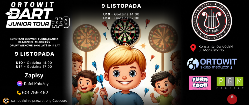 Zawody w steel darta dla dzieci z rocznika 2015 i młodszych. Turniej wliczany jest do rankingu ORTOWIT Dart Junior Tour U10 - 2025/2026 Ranking obejmuje 8 turniejów rozgrywanych w miesiącach: wrzesień 2025, październik 2025, listopad 2025, grudzień 2025, styczeń 2026, luty 2026, marzec 2026, kwiecień 2026 (może się zmienić). Do punktacji końcowej rankingu wliczane są punkty z 6 najlepszych startów zawodnika. Szczegółowy format i harmonogram poszczególnego turnieju publikowany jest zawsze po zamknięciu listy zgłoszeń. Wpisowe na turniej : 20zł płatne przed rozpoczęciem zawodów |
