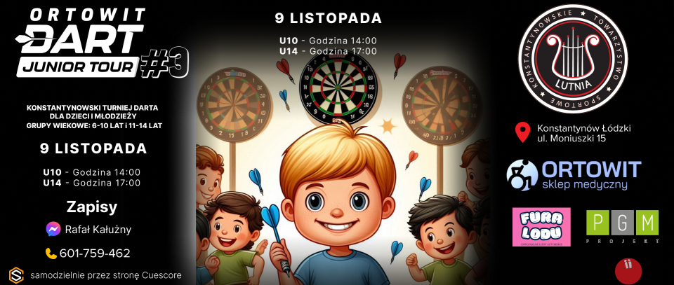 Zawody w steel darta dla dzieci z rocznika 2011 i młodszych. Turniej wliczany jest do rankingu ORTOWIT Dart Junior Tour U10 - 2025/2026 Ranking obejmuje 8 turniejów rozgrywanych w miesiącach: wrzesień 2025, październik 2025, listopad 2025, grudzień 2025, styczeń 2026, luty 2026, marzec 2026, kwiecień 2026 (może się zmienić). Do punktacji końcowej rankingu wliczane są punkty z 6 najlepszych startów zawodnika. Szczegółowy format i harmonogram poszczególnego turnieju publikowany jest zawsze po zamknięciu listy zgłoszeń. Wpisowe na turniej : 20zł płatne przed rozpoczęciem zawodów |